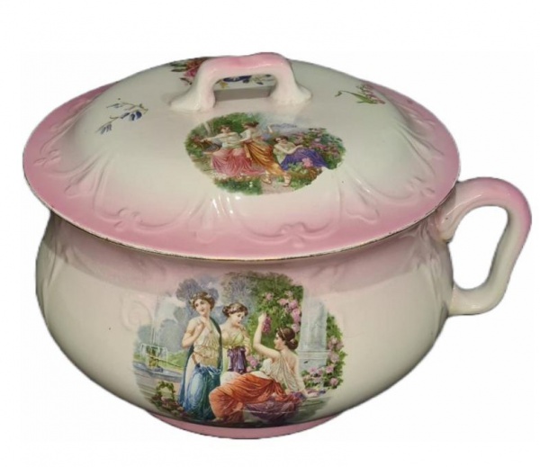 • ANTIGO PINICO COM TAMPA EM FAIANÇA INGLESA, MANUFATURA WOODS & SONS, COM RICA DECORAÇÃO. MEDINDO 20 X 24 X 29 CM