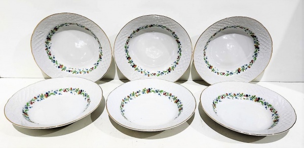 • Beatriz - Natal (RN) - Seis pratos fundos em porcelana branca com decoração em guirlanda floral com bordas em padrões florais em alto relevo, bordas filetadas a ouro. 1 com bicado. Medida: 23 cm diâmetro