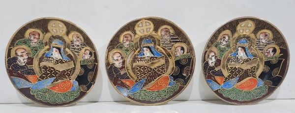 • LOTE COM TRÊS PIRES EM PORCELANA JAPONESA PADRÃO SATSUMA. MARCA J.H. MARCAS DO TEMPO. MEDINDO 13 CM