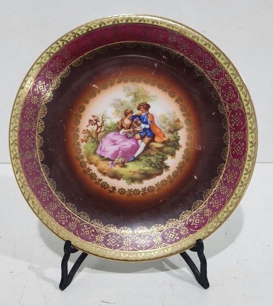• ANTIGO PRATO DE COLEÇÃO COM DECORAÇÃO CENA GALANTE. FRAGONARD. PORCELANA DA BAVÁRIA. PERDAS NA DOURAÇÃO. MEDINDO 19.5 CM