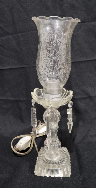 • Castiçal em demi cristal. adaptado para abajur Cúpula lavrada com ramos de flores e volutas. Coluna gomada e torneada.  Pingentes no feitio de lança (um colado). Medindo 36 x 10 x 10 cm