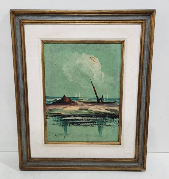• SÉRGIO RICARDO. Óleo sobre tela. Medidas. 39.5 x 29.5 cm. Com moldura 62.5 x 52.5 cm. Assinado canto inferior direito. "Marina com barco"