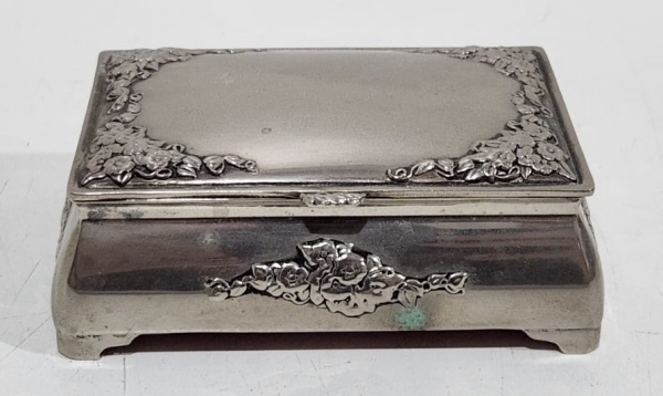 • ANTIGA CAIXA PORTA JÓIAS EM METAL PRATEADO. MEDINDO 3 X 6 X 9 CM