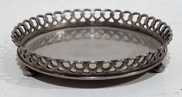 • Salva em metal espessurado a prata apoiada sobre três pés e galeria vazada, Medindo 2 x 11 cm