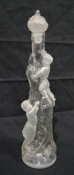 • Garrafa em vidro francês na forma de torre com figuras em relevo. Reprodução de peça Legras. Apresenta a inscrição deposé ao fundo - alt. 34 cm X 8.5 cm diam