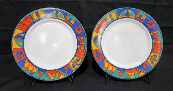 • PAR DE PRATOS GRANDES E RASOS EM PORCELANA ESMALTADA E RICAMENTE POLICROMADA. PORCELANA RENNER. ORIUNDO DA LOJA TOK % STOK. MEDINDO 28 CM