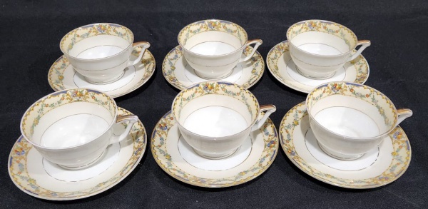 • Bohemia Porcelán Moritz Zdekauer, Karlovy Vary - Conjunto de seis xícaras de chá em porcelana tcheca ricamente decorada. obs: 2 xícaras com fio de cabelo e 1 pires com bicado. Medindo a xícara 5.5 x 9.5 x 11.5 cm e o pires 14.5 cm