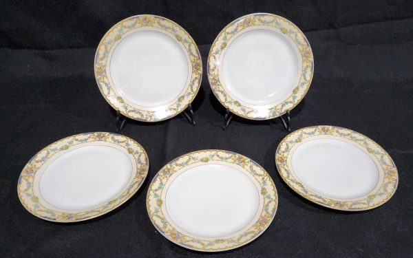 • Bohemia Porcelán Moritz Zdekauer, Karlovy Vary - Conjunto de cinco pratos de sobremesa em porcelana tcheca ricamente decorada. obs: 1 prato com borda colada. Medindo 16 cm
