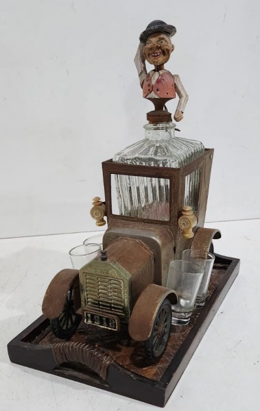 • LICOREIRA MUSICAL COM FUNCIONAMENTO À CORDA EM FORMATO DE CARRINHO - Linda e rara peça japonesa de coleção. Jogo composto por licoreira e 4 cálices. Medida 30.5  x 15.5 x 26 cm. Precisa revisão na caixa musical.