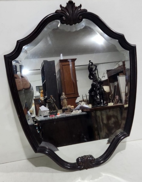 • Espelho em cristal bisotado emoldurado em madeira nobre e recortado em curvas e encimado por florão com ramos em relevo. Mede 66 X 52 cm