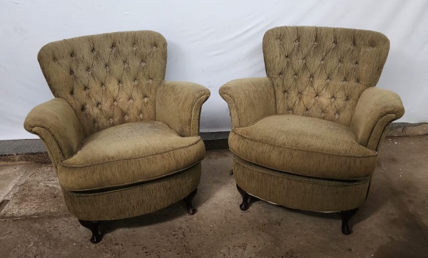 • Par de poltronas  com encosto arqueado e braços revirados. Assento circular apoiado em pés dianteiros recurvos. Estofamento capitonê. Precisando limpar e lavar. Marcas de uso. Medindo 75 x  60 x 80 cm