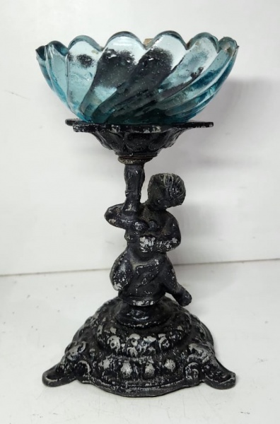 • Antigo castiçal em metal em forma de anjo tocheiro, bobeche em formato de flor e pés em gárgula. Peça marcada na base. Medindo 19 x 9 x 9 cm