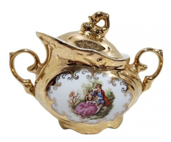 • PORCELANA  SCHMIDT - Belíssimo Açucareiro, executado em fina porcelana branca, com farta aplicação de ouro, trabalhado em florais, cena galante em reserva, pegas repuxadas, borda em relevos. Marcado na base. Medindo 13 x 10 x 17 cm