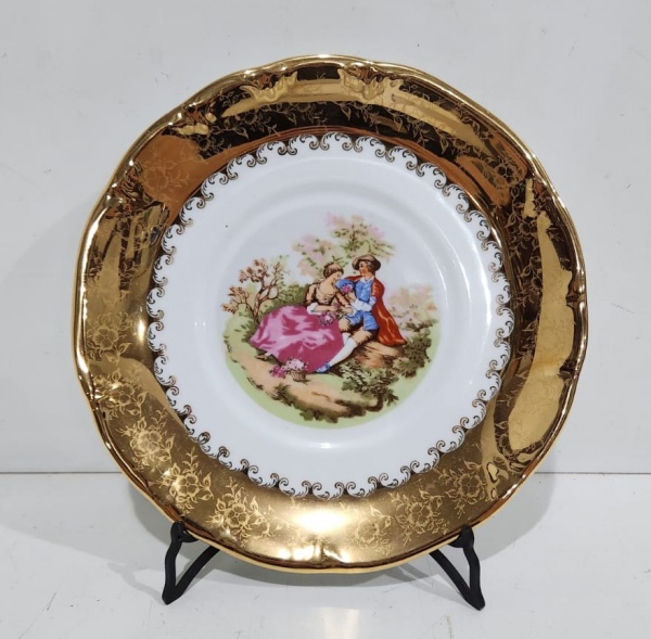 • PORCELANA  SCHMIDT - Belíssimo Prato para Bolo,  executado em fina porcelana branca, com farta aplicação de ouro, trabalhado em florais, cena galante em reserva, pegas repuxadas, borda em relevos. Marcado na base. Medindo 28 cm
