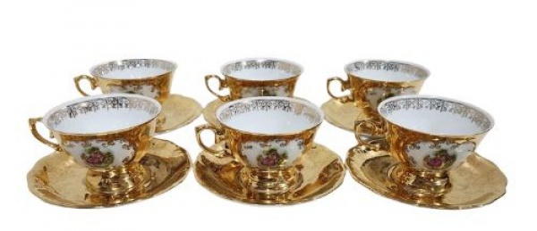 • PORCELANA  SCHMIDT - Belíssimo conjunto de seis Xícaras de Chá,  executadas em fina porcelana branca, com farta aplicação de ouro, trabalhado em florais, cena galante em reserva, pegas repuxadas, borda em relevos. Marcado na base. Medindo 6.5 x 9.5 x 11.5 cm e o Pires 14 cm