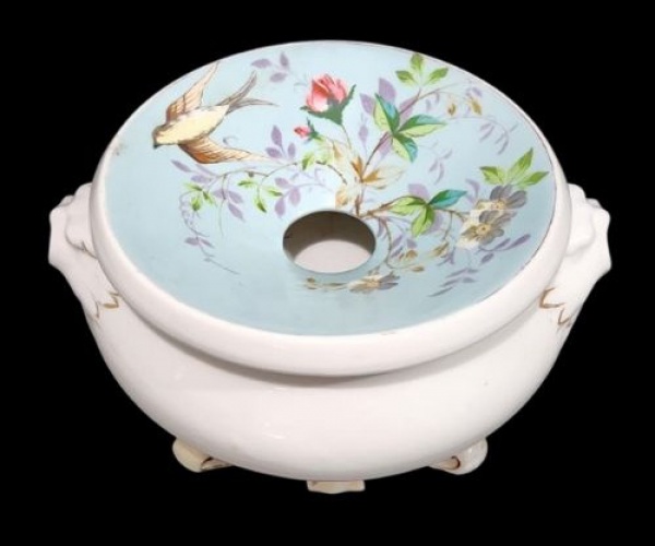 • VIEUX PARIS - SÉCULO XIX - Escarradeira em porcelana francesa esmaltado com flores e pássaro. Base com volutas. Medindo 14 X 24 cm. Com restauro