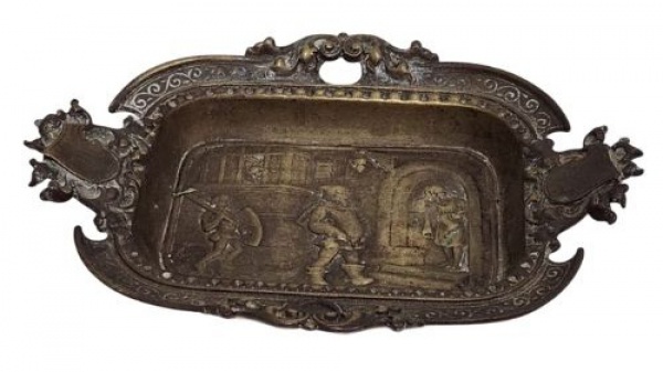 • ANTIGO CENTRO DE MESA EXECUTADO EM BRONZE RICAMENTE CINZELADO. MEDINDO 3.5 X 15.5 X 21.5 CM