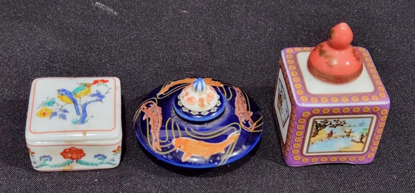 • SET DE TRÊS CAIXAS PORTA COMPRIMIDOS DE COLEÇÃO EM PORCELANA E METAL. MEDINDO A MAIOR 4 X 3.5 X 5.5 CM E A MENOR 2 X 2.5 X 6 CM