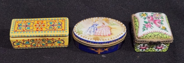 • SET DE TRÊS CAIXAS PORTA COMPRIMIDOS DE COLEÇÃO EM PORCELANA E METAL. MEDINDO A MAIOR 3 X 4 X 4.5 CM E A MENOR 2.5 X 2.5 X 6 C M