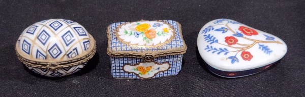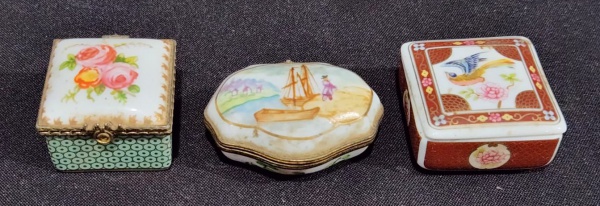 • SET DE TRÊS CAIXAS PORTA COMPRIMIDOS DE COLEÇÃO EM PORCELANA E METAL. MEDINDO A MAIOR 2.5 X 5.5 X 6 CM E A MENOR 3 X 4 X 5 CM ( 1 COM BICADO ). PEÇA MARCADA NO FUNDO