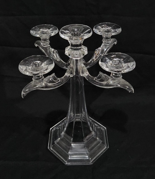 • Castiçal em cristal translúcido para 5 velas. Com bicado. Medindo: 36 x 32 cm