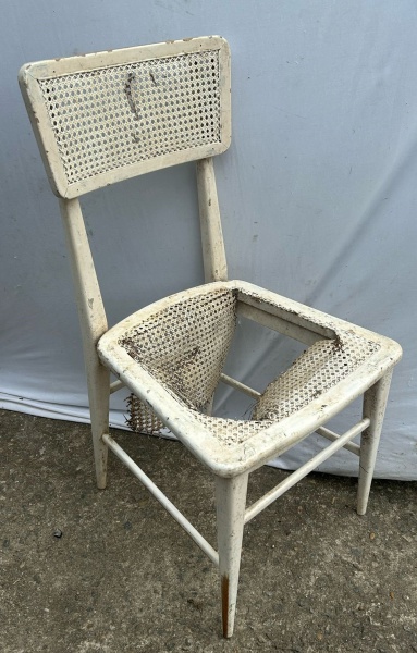 • Antiga cadeira executada em madeira nobre dos anos 60. Pintada na cor branca. Peça para restauro. No estado conforme fotos. Medindo 88 x 45.5 x 47 cm