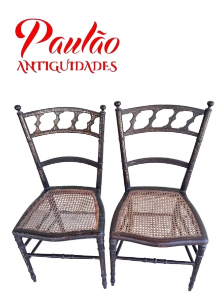 • Maravilhoso par de cadeiras no estilo império em madeira nobre pintadas na cor preto e com aplicação de madrepérolas e assento em palha indiana, Com desgastes na pintura, uma delas com falta de madrepérolas, Peça de época. Medindo 85 x 38  x  42 cm