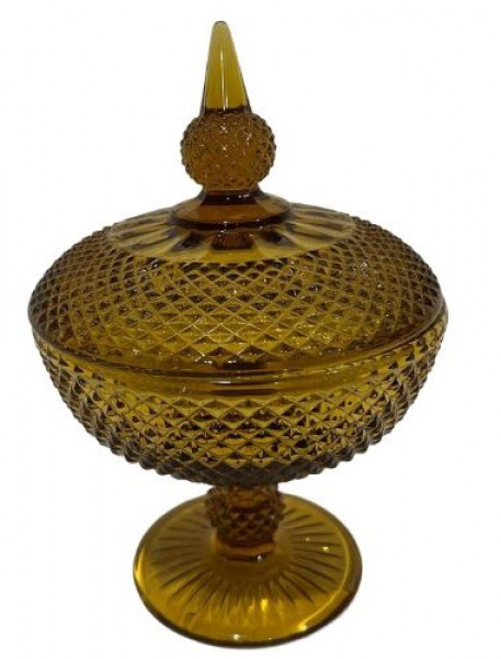 • Antiga compoteira em vidro na cor ambar padrão bico de jaca, Medindo 23 x 15.5 cm