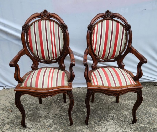 • PAR DE  LINDAS CADEIRAS DE BRAÇO DITAS MEDALHÃO DUPLO EXECUTADAS EM MADEIRA NOBRE E ESTOFADAS. UMA COM RESTAURO NO BRAÇO. MEDINDO 103 X 50 X 54.5 CM