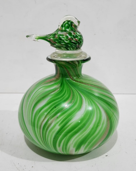 • Garrafa em murano com pó de cobre em tom verde degrade. Tampa em formato de passarinho . Medindo 21.5 x 15 cm
