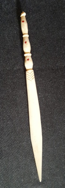 • Abridor de livros  em marfim, com incrustações no cabo, arrematado  por entalhe de uma figa.Med 17 cm