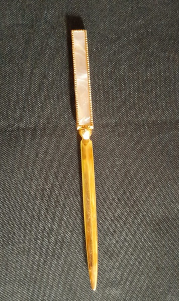 • Abridor de livros em madrepérola com metal dourado. Em seu estojo original.  Med  18,5  cm x Estojo 21,5 cm