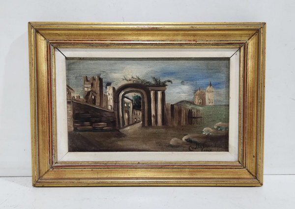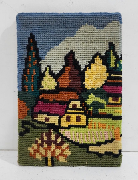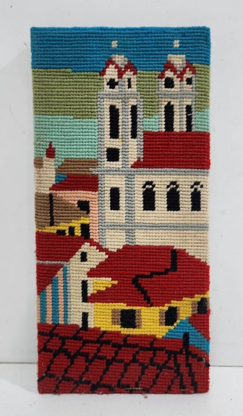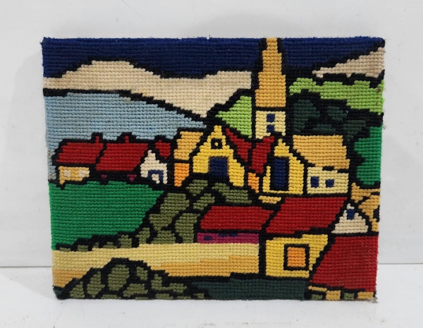 • ANTIGO QUADRO DECORATIVO EM TAPEÇARIA RETRATANDO CASARIOS. MEDINDO 18 X 23 CM