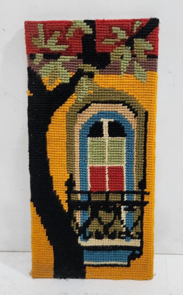 • ANTIGO QUADRO DECORATIVO EM TAPEÇARIA RETRATANDO UMA SACADA COLONIAL DE UMA CASA. MEDINDO 29.5 X 14 CM
