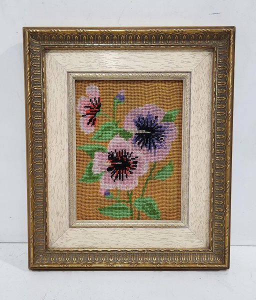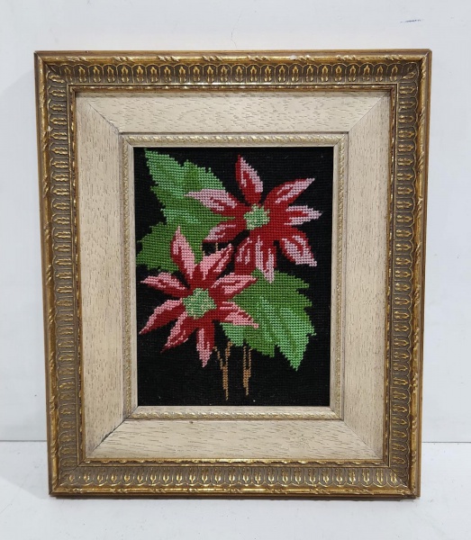 • ANTIGO QUADRO DECORATIVO EM TAPEÇARIA RETRATANDO UMA FLOR. MEDINDO 32  X 27.5 CM