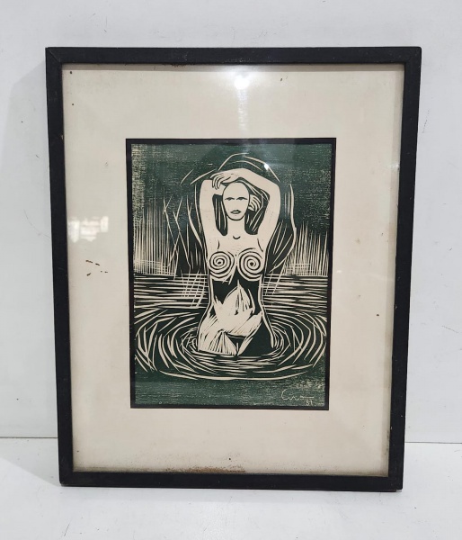 • CIRO - ANTIGA XILOGRAVURA ASSINADA E DATADA 81. MOLDURA COM RESQUÍCIOS DE CUPIM. MEDINDO 37.5 X 30.5 CM