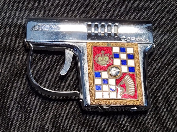 • Isqueiro da marca Corona. Em formato de pistola com cabo decorado com brasão. Não testado e sem garantias de funcionamento. Medindo 4.5 x 6 cm