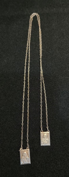 • PRATA DE LEI - ESCAPULÁRIO EM PRATA RETRATANDO SAGRADO CORAÇÃO DE JSEUS E NOSSA SENHORA DO CARMO. MEDINDO 40 CM E PESANDO 5.3 CM
